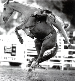 The man in the photo is about to be thrown off his horse. He is trying very hard to stay on a bucking bronc -- a horse that hasn't been "broken," or made suitable for riding. Bareback bronc riding is an event at the Buffalo Bill Rodeo during a celebration of Nebraskan culture called Nebraskaland Days in North Platte. The idea for the Buffalo Bill Rodeo came from the man himself, Buffalo Bill.
