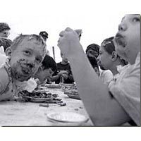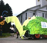 The 1999 Hancock parade may have been small, but its floats were original: a Y2K bug, ridden by members of Hancock's Y2K committee; Chicken Little whose umbrella had computer discs stuck to it, since the sky was falling in bits and bytes; and a "living" painting of a re-enactment of the Iwo Jima flag raising. The historical society's "penny-farthing" bicycle, which has been a parade favorite for 45 years, sported a five-foot tall wheel composed of a garden hose. Other paraders were the Temple Marching Band and the Hancock High School classes of 1954, 1943, and 1938.